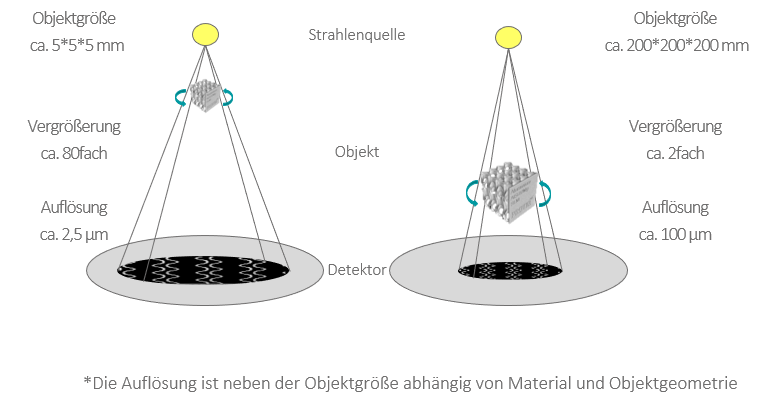 CT-Scans. Hierbei stehen die Objektgröße und die generierte Auflösung des CT-