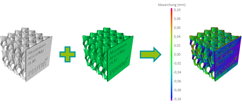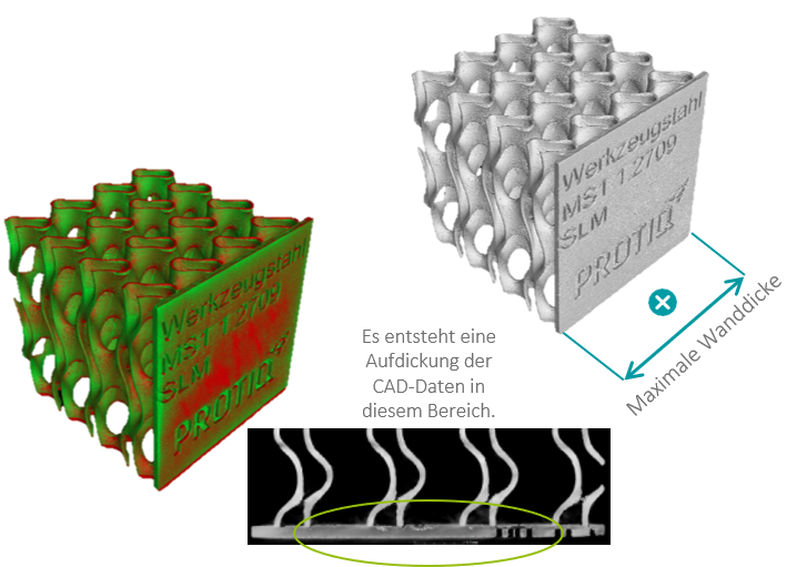 Im Nachgang an den CT-Scanprozess des 3D-gedruckten Bauteils erfolgt eine Konvertierung der generierten Informationen in ein Oberflächenmodell (STL) . Die beschriebenen Einflussfaktoren Objektgröße, Material und Wanddicke haben dabei direkten Einfluss auf die Qualität der generierten STL-Daten.