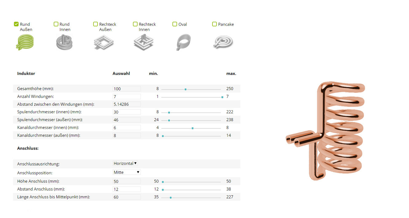 Determine your desired dimensions based on height, cross-section and diameter. You can also specify the number of windings as well as the diameter and spacing of coils and ducts.