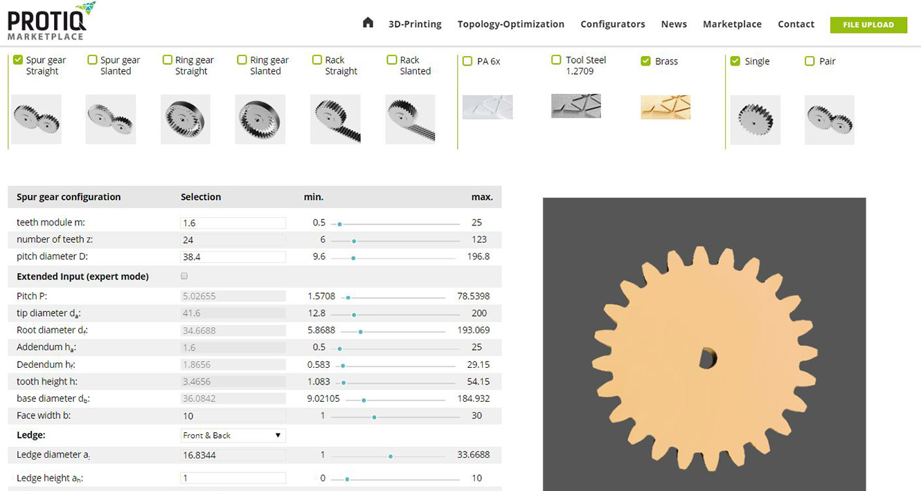 The configurator offers three basic geometries: a spur gear, a ring gear and a toothed rack. All three versions can be provided with straight or slanted toothing. A total of 20 parameters can be selected for the creation of your individual gear. You can configure either a single part or a pair, which corresponds to two spur gears, a ring gear and a spur gear, or a toothed rack with spur gear. In addition to tool steel 1.2709, there are two innovative materials available exclusively from PROTIQ: brass and a plastic we specially developed for the configurator (PA6X).